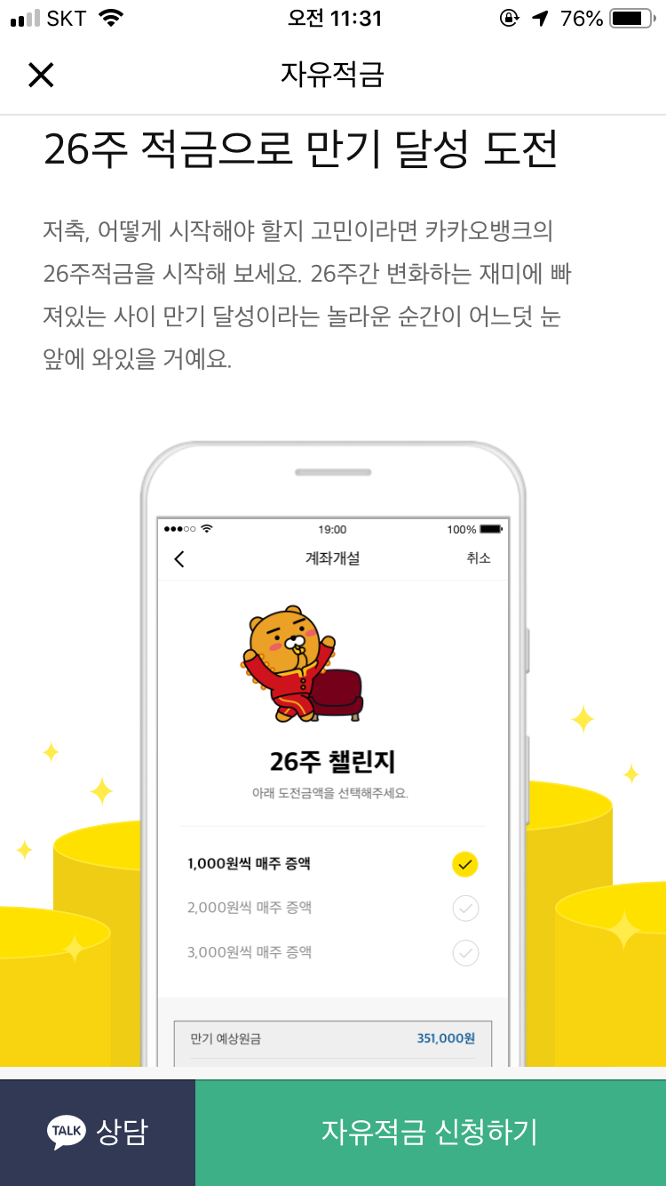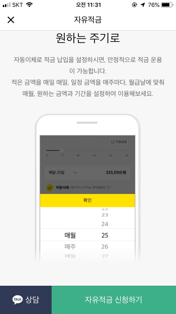 적금 풍차돌리기의 단점인 매월 통장을 새로 가입해야 되는 것을 앱으로 쉽게 가입할 수 있어서 카카오가 쉽고 좋더라고요.