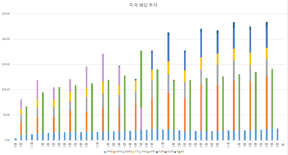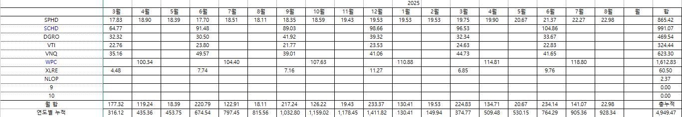2025년 8월까지 각 종목마다 배당된 누적 배당금은 SPHD가 865.42 달러, SCHD는 991.07 달러, DGRO는 469.54 달러, VTI는 324.44 달러, VNQ는 623.30 달러, WPC는 1,612.83 달러, XLRE는 60.50 달러, NLOP는 2.37 달러입니다.