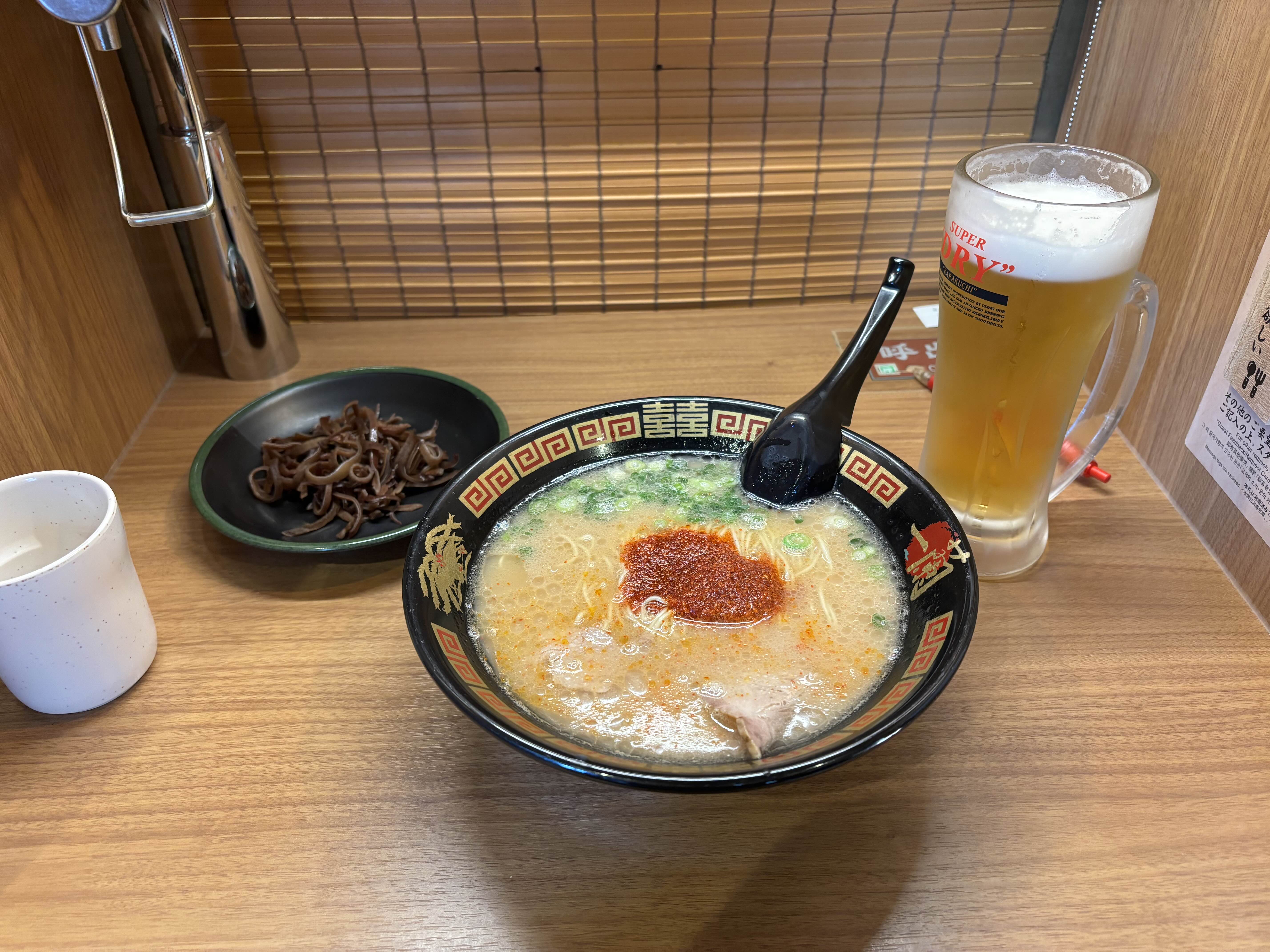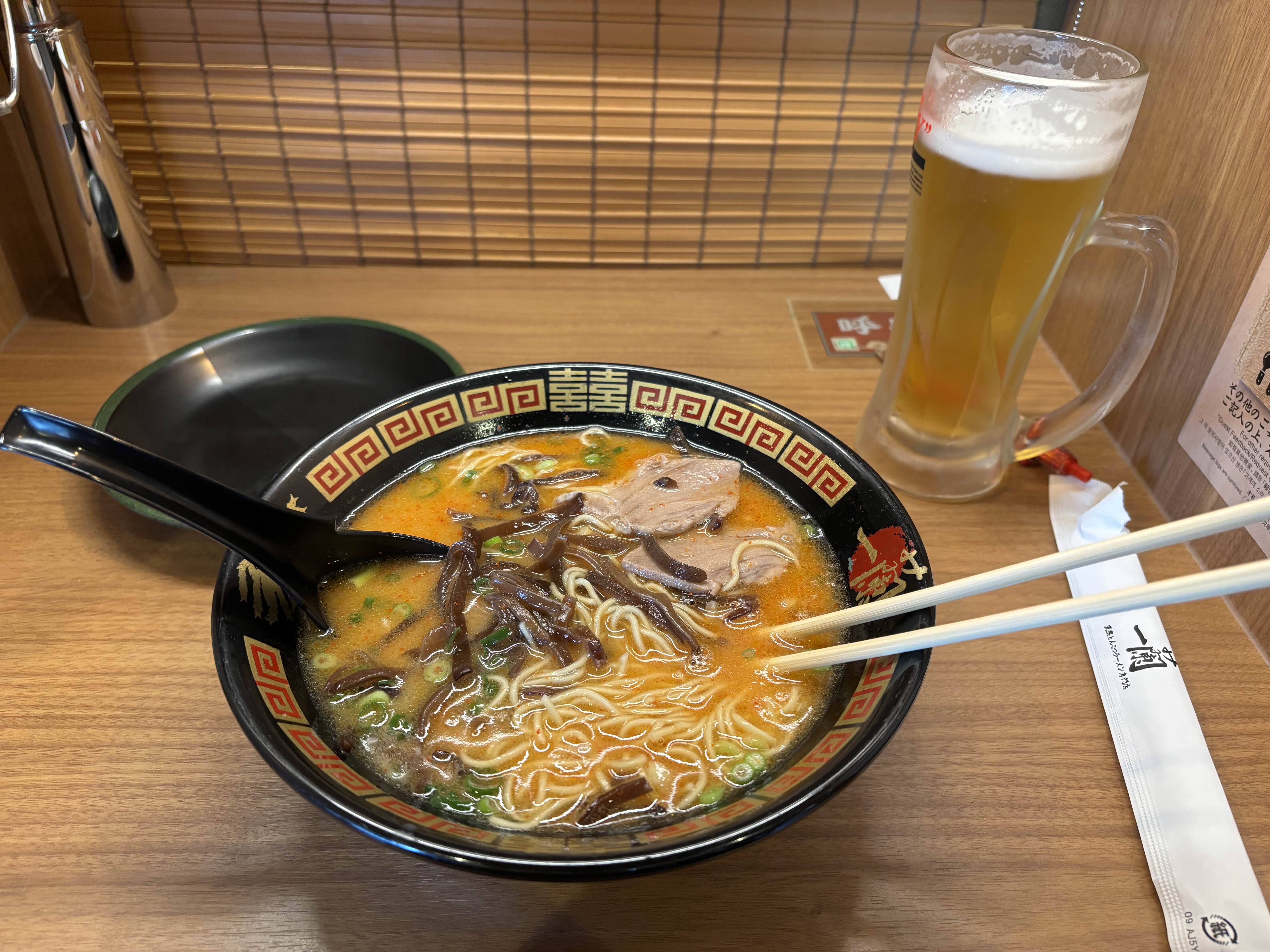 제가 주문한 이치란 라멘과 맥주입니다.