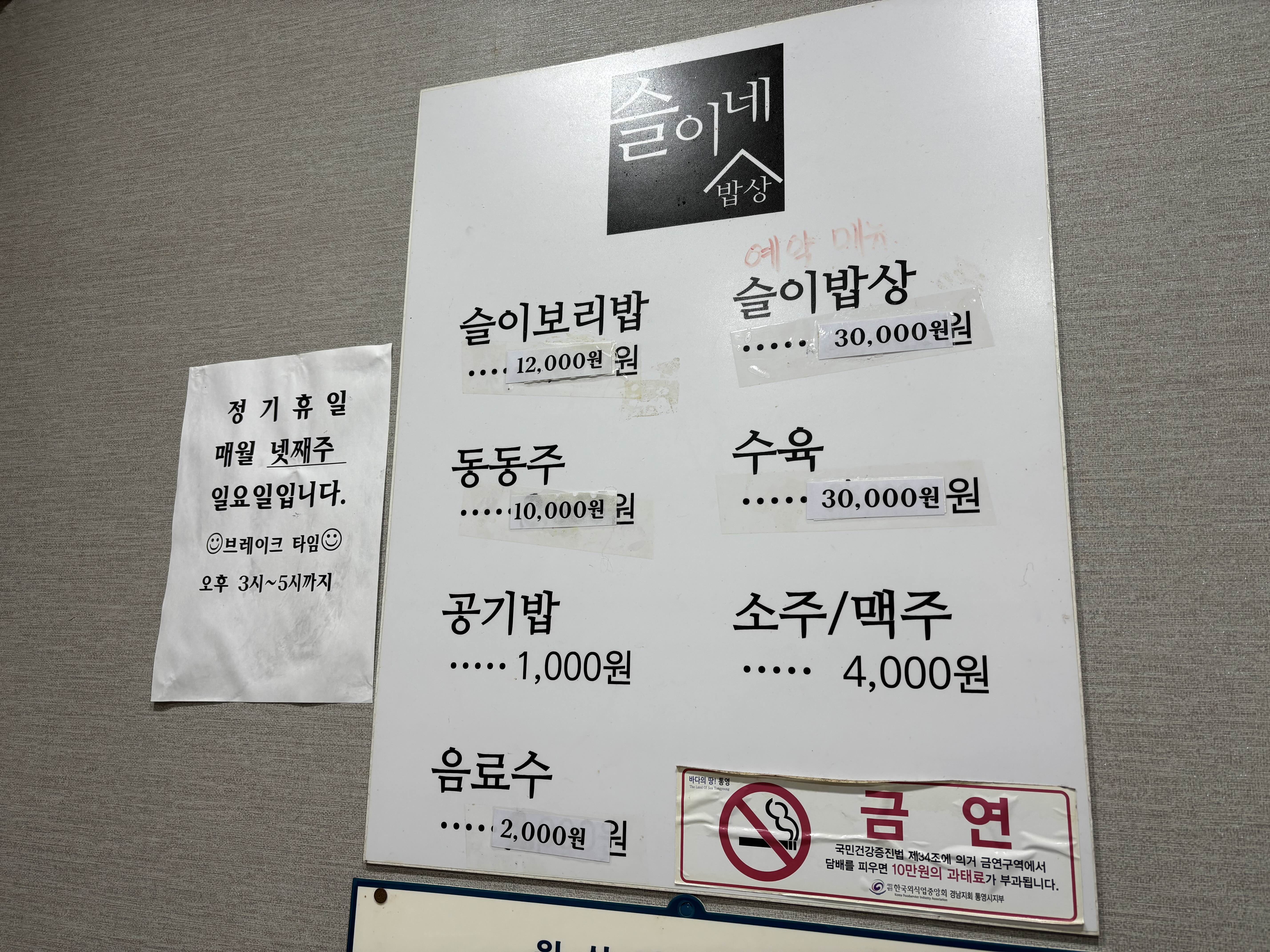예약 메뉴인 슬이밥상은 30,000원, 동동주는 10,000원, 수육은 30,000원이네요.