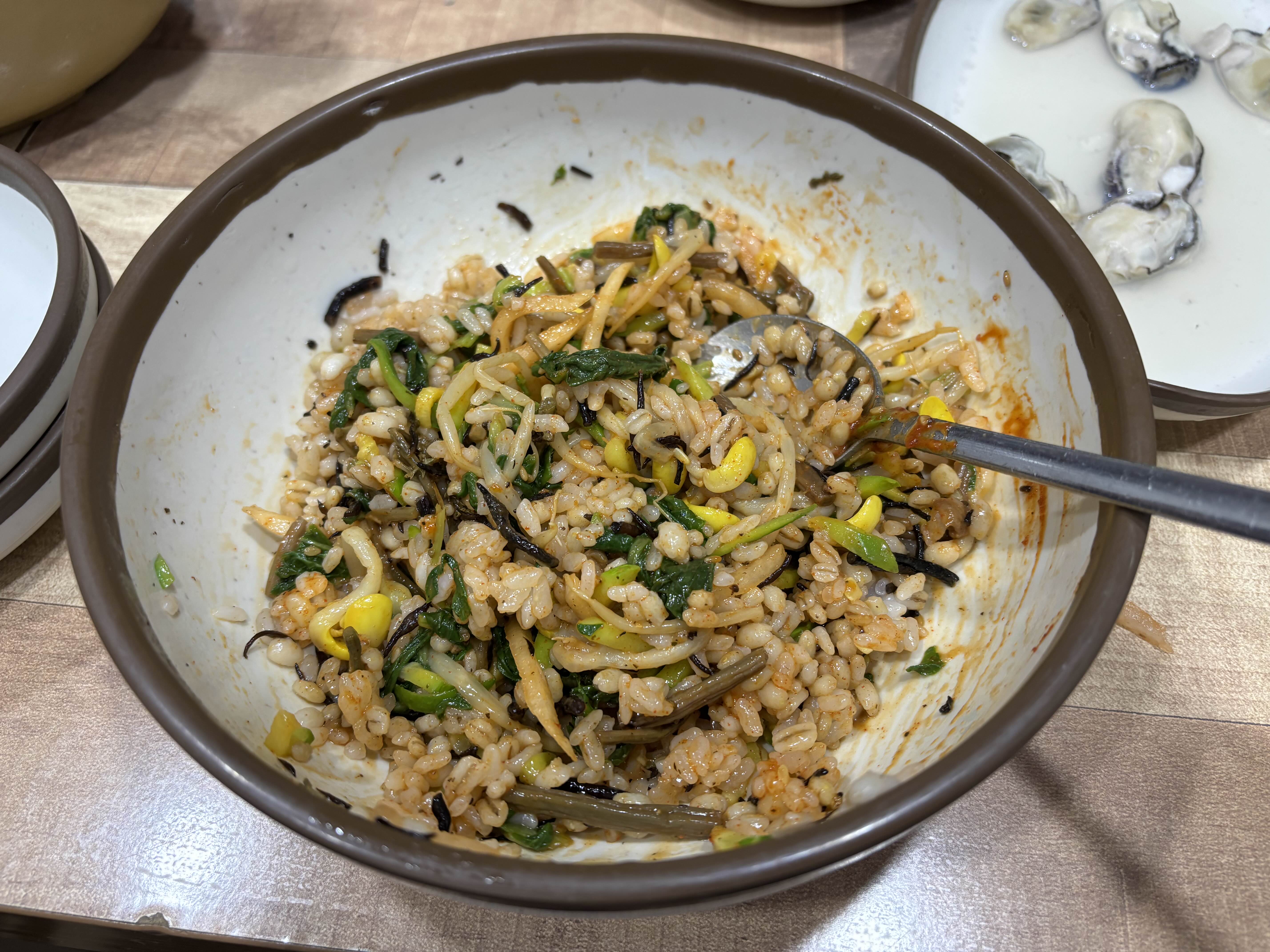 대접에 야채들을 넣고 양념장도 첨가하여 슥슥 비벼주면 보리밥 완성입니다.