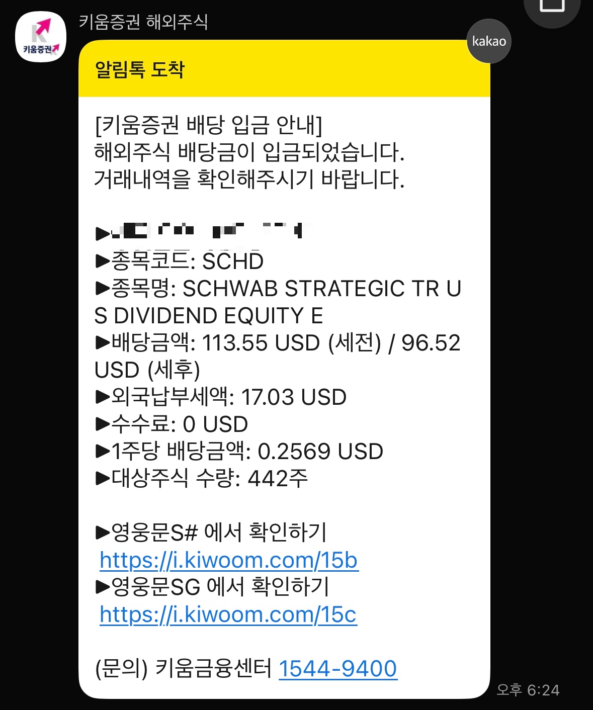 저의 미국 배당 투자 계좌의 주력인 SCHD에서 배당금이 입금되었습니다.