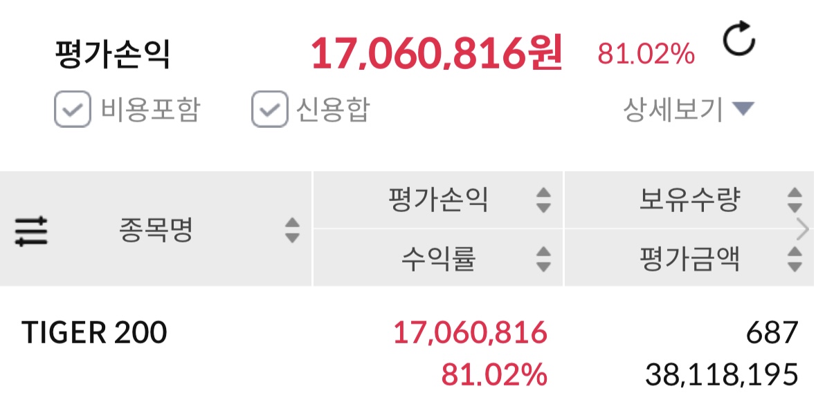 이번에 매도한 64주가 빠지면서 제가 가지고 있는 tiger200의 총 수량은 687주가 되었습니다.